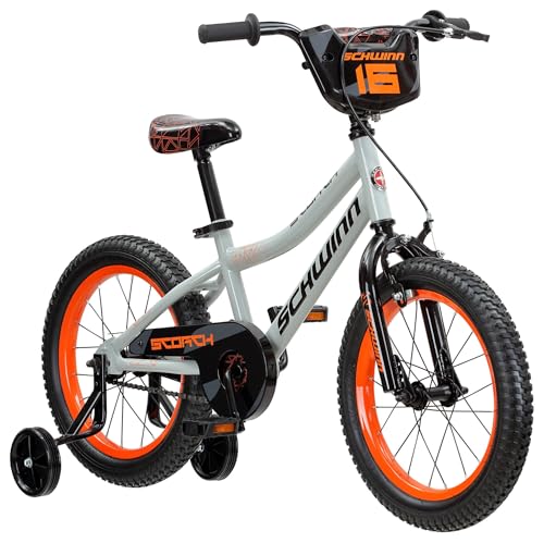 - The Schwinn Scorch boy’s bike with 16-inch wheels comes ready to be assembled and includes training wheels and a racing-style number plate.